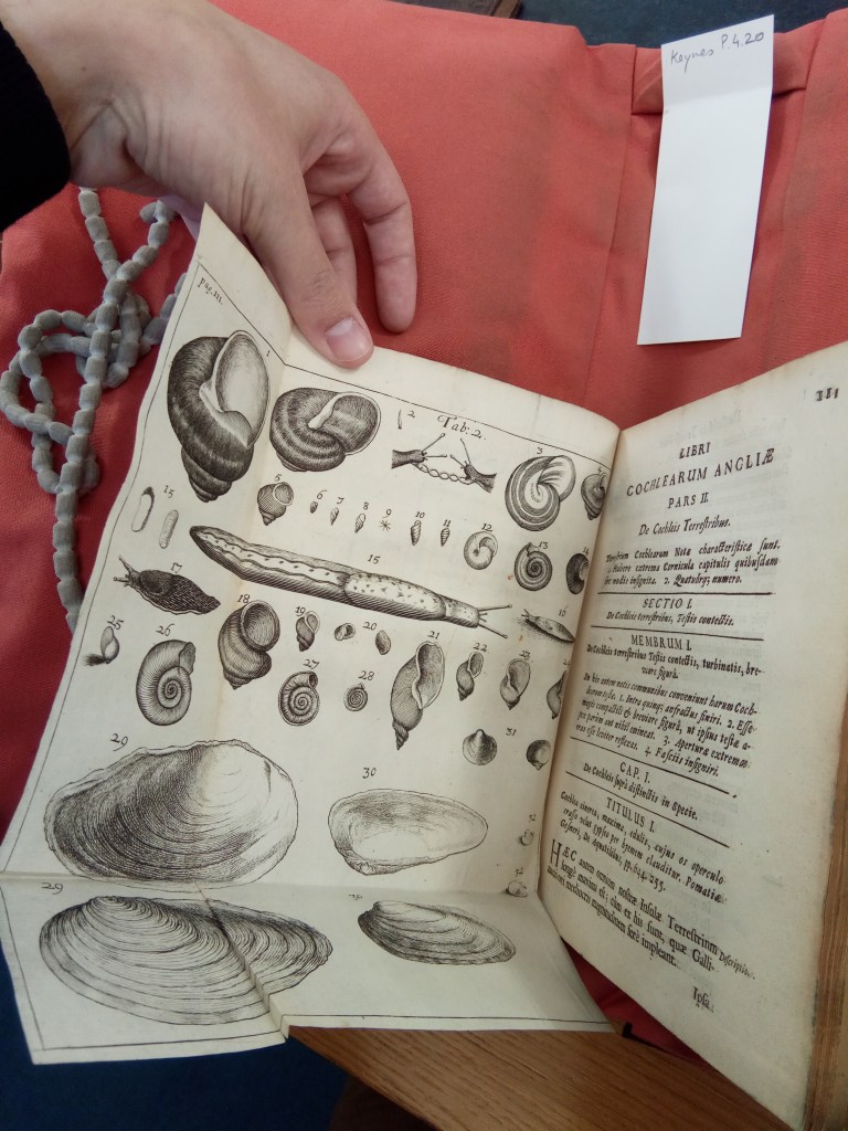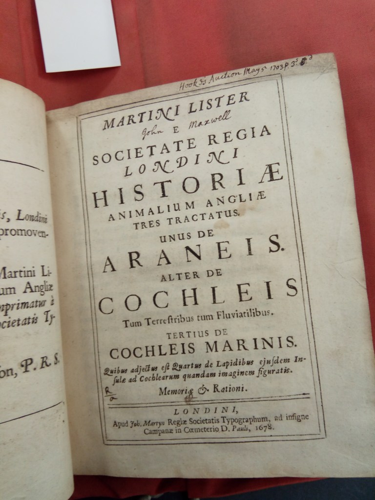 Pe urmă, nu-ți rămâne decât să descoperi comorile. Ca cea de mai jos, copia lui Robert Hooke din Istoria naturală semnată de Martin Lister. În dreapta-sus se poate vedea un acquisition note de după licitația bibliotecii lui Hooke, de mâna noului proprietar, John Maxwell.