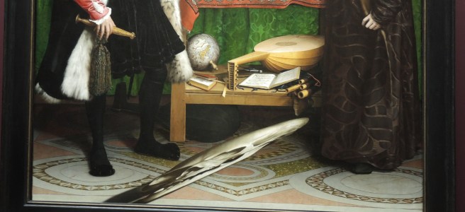 Cei doi bărbați, pictați în mărime aproape naturală (tabloul este aproximativ pătrat, cu dimensiuni de 207x209 cm), confiscă privirea la început cu carura lor de oameni înstăriți, bine îmbrăcați, ei înșiși privindu-i pe vizitatorii lor în ochi. Sunt două portrete parcă paralele și cumva complementare: Jean de Dinteville, opulent, îmbrăcat cu o haină blănoasă, cu brandenburguri și mâneci bufante trei sferturi, cu o cămașă de mătase cârmâziu-ciclame și un pandantiv greu de aur la gât de care atârnă un medalion reprezentându-l pe Arhanghelul Mihail care are la picioare un craniu. De partea cealaltă, Georges de Selves, mai auster, cu haine mohorâte și cu o pereche de mănuși în mână, semn că se pregătește să plece (sau că e în trecere pe-acolo).